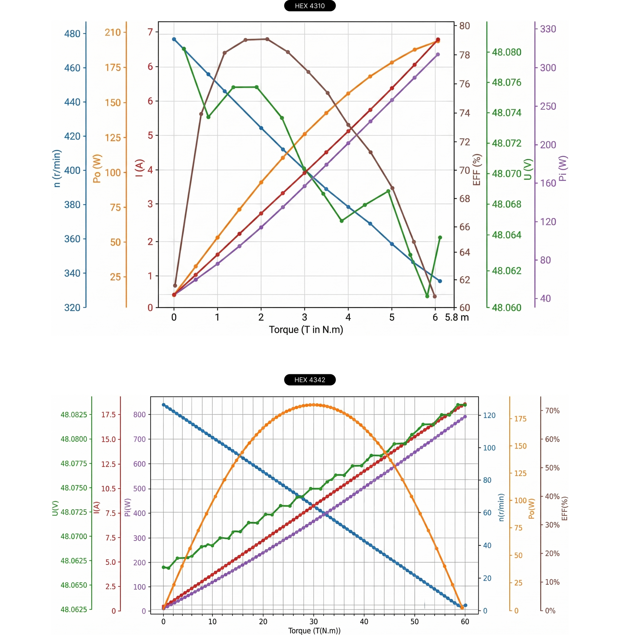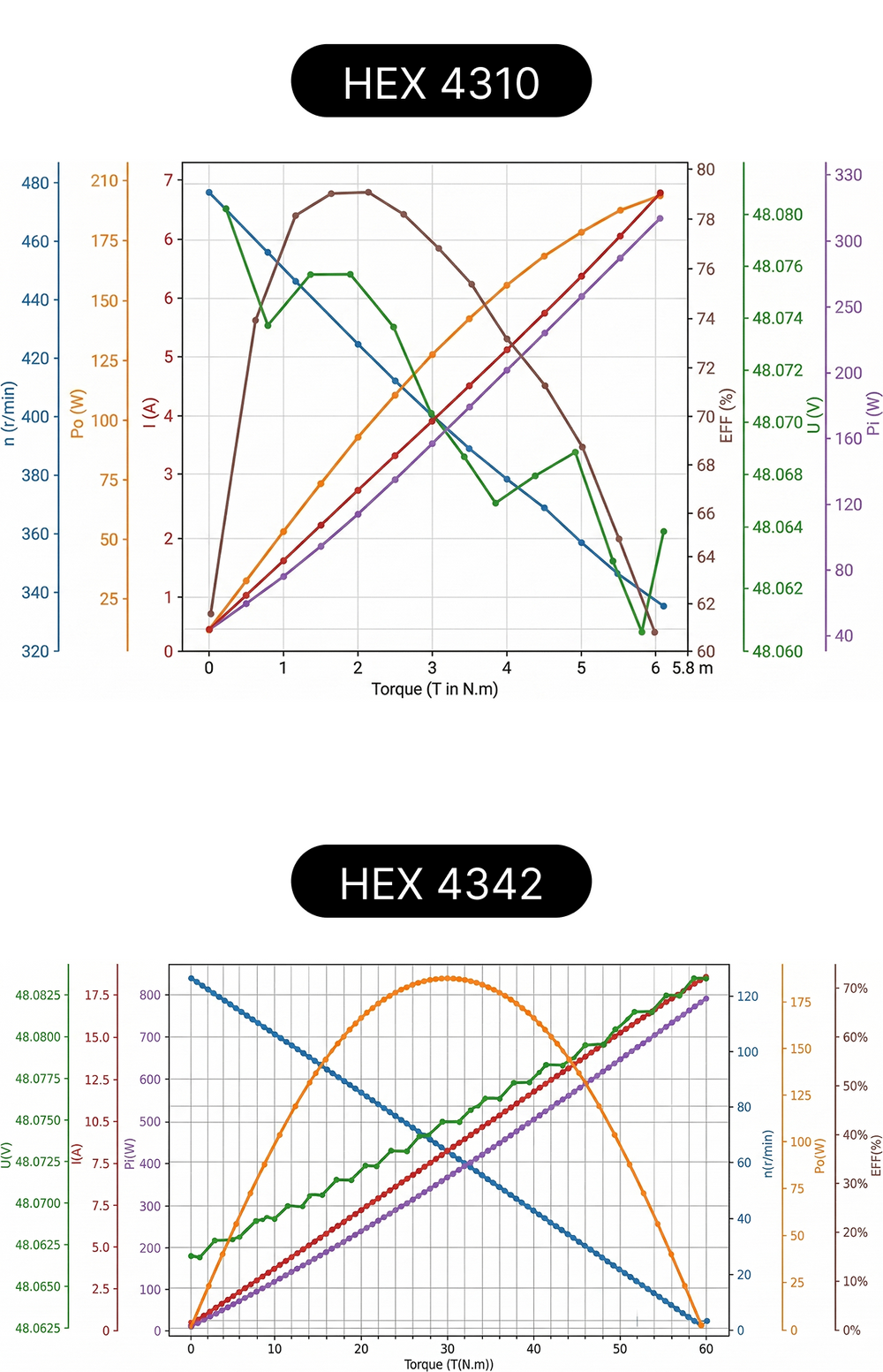 4310: 128W power, 3 Nm rated, 7 Nm peak | 4342: 9 Nm rated, 30 Nm peak